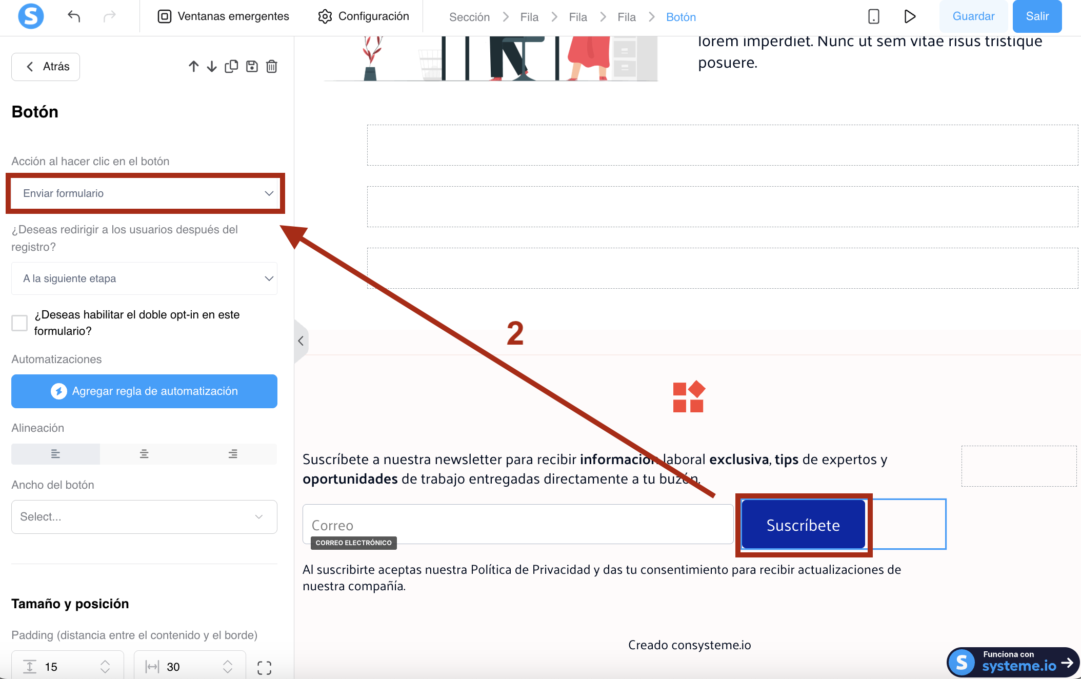 - Para la opción acción al hacer clic en el botón cuando, selecciona Enviar formulario