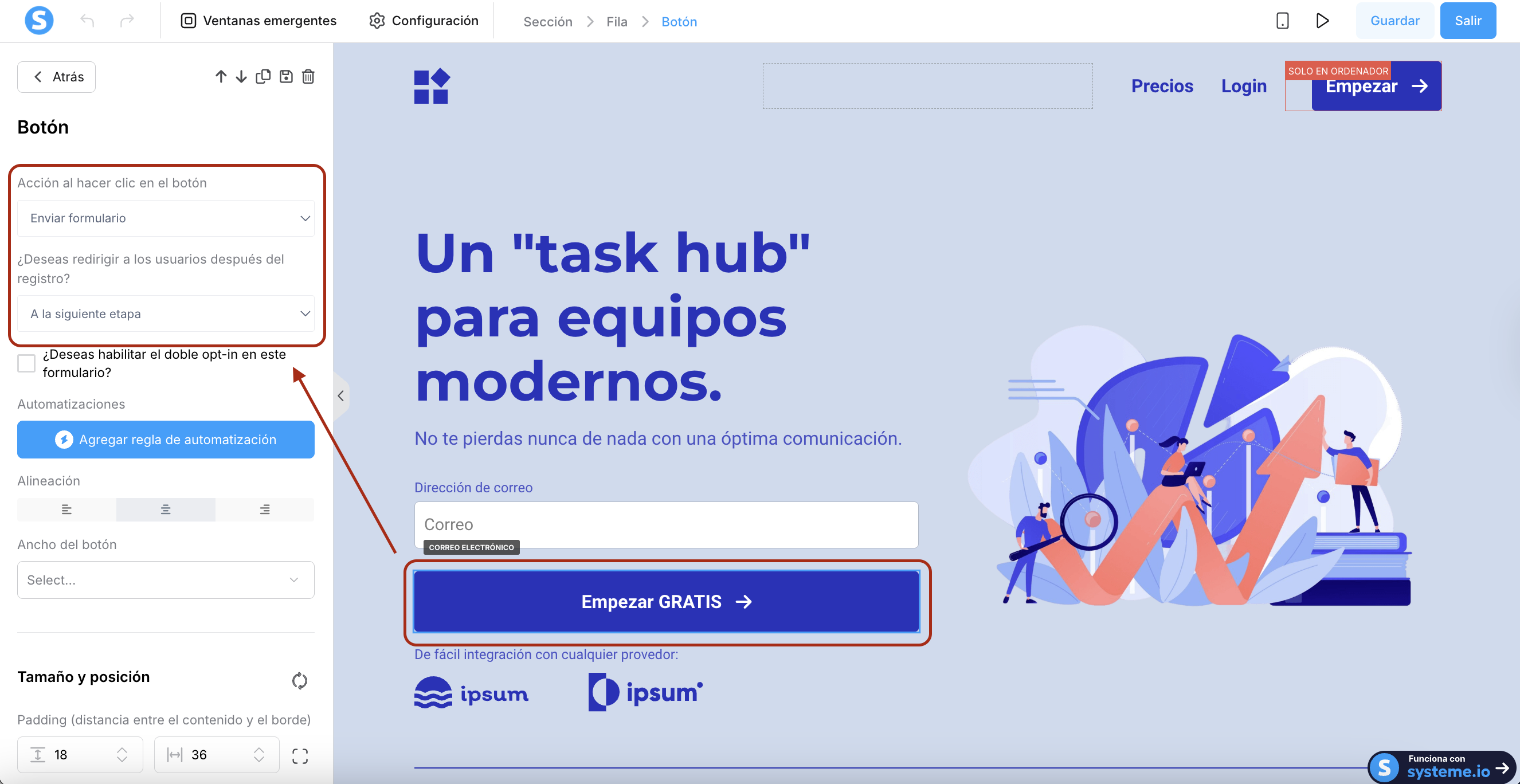 - Para la opción Acción al hacer clic en el botón, selecciona Enviar formulario