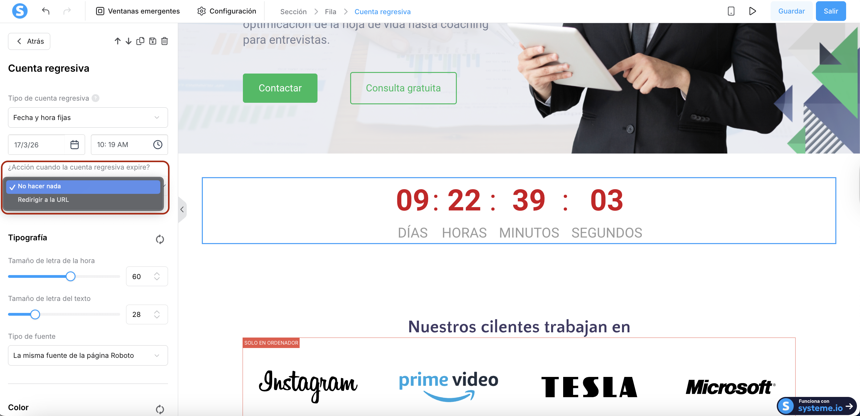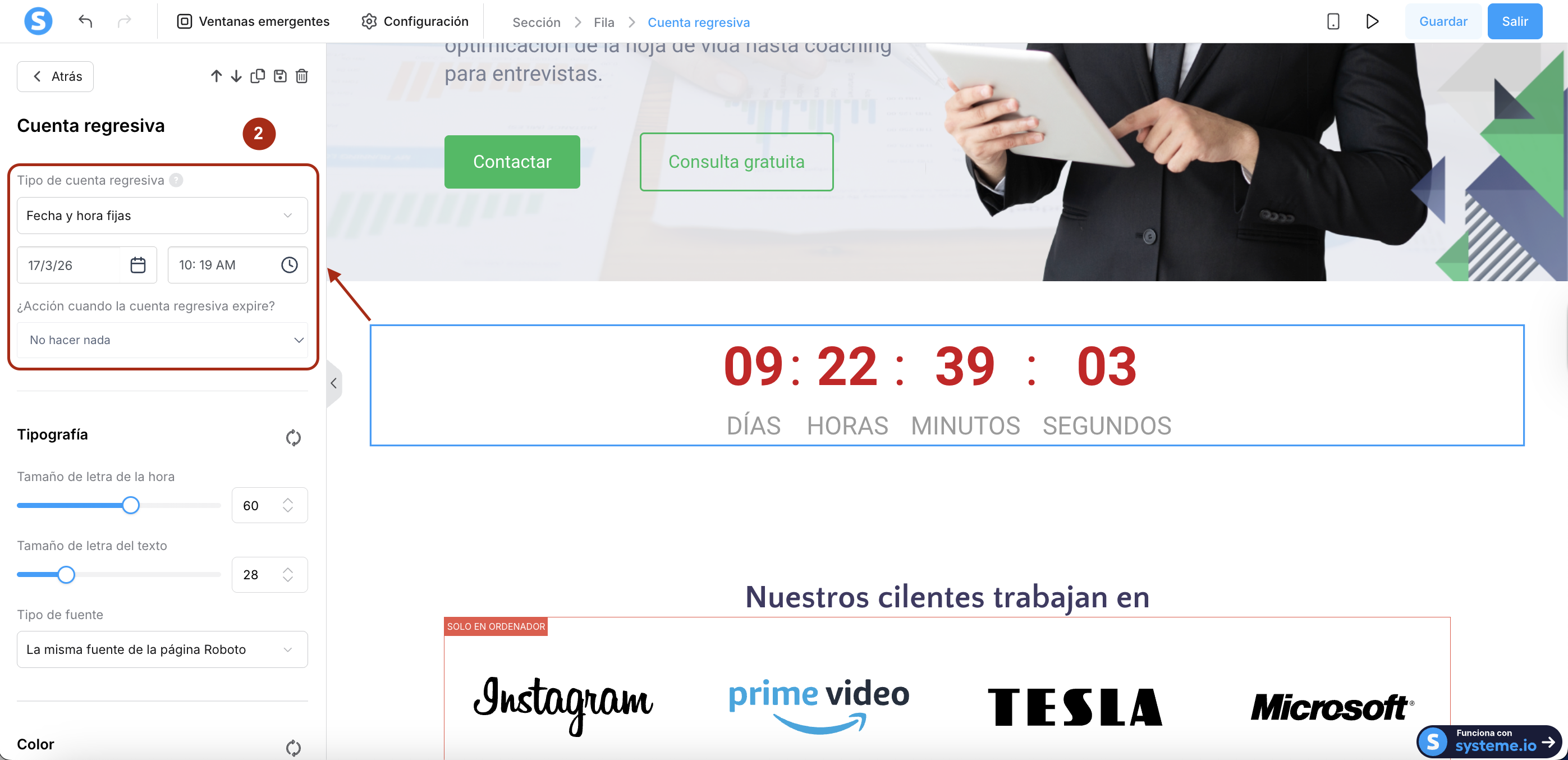 Haz clic en la cuenta regresiva para abrir su configuración. Desde el menú desplegable Tipo de cuenta regresiva, selecciona Fecha y hora fijas (2).