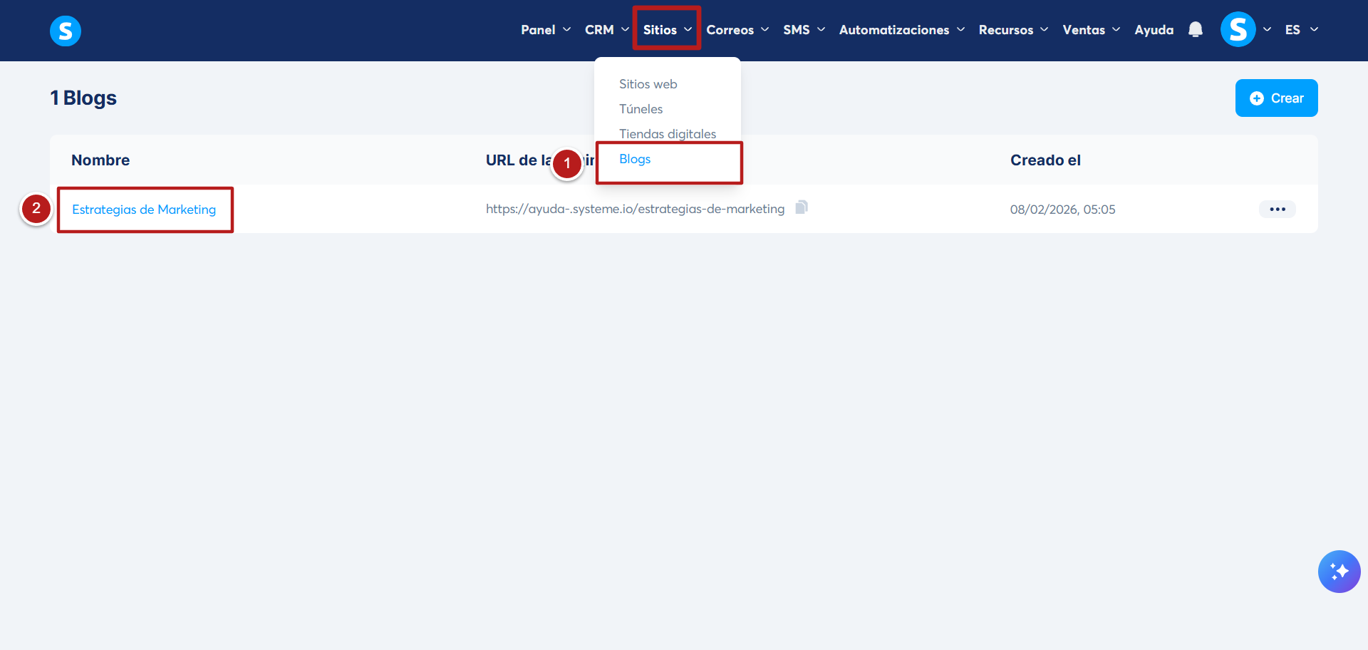 Dirígete a la pestaña "Blogs" (número 1) luego haz clic en "el nombre del blog" (número 2).