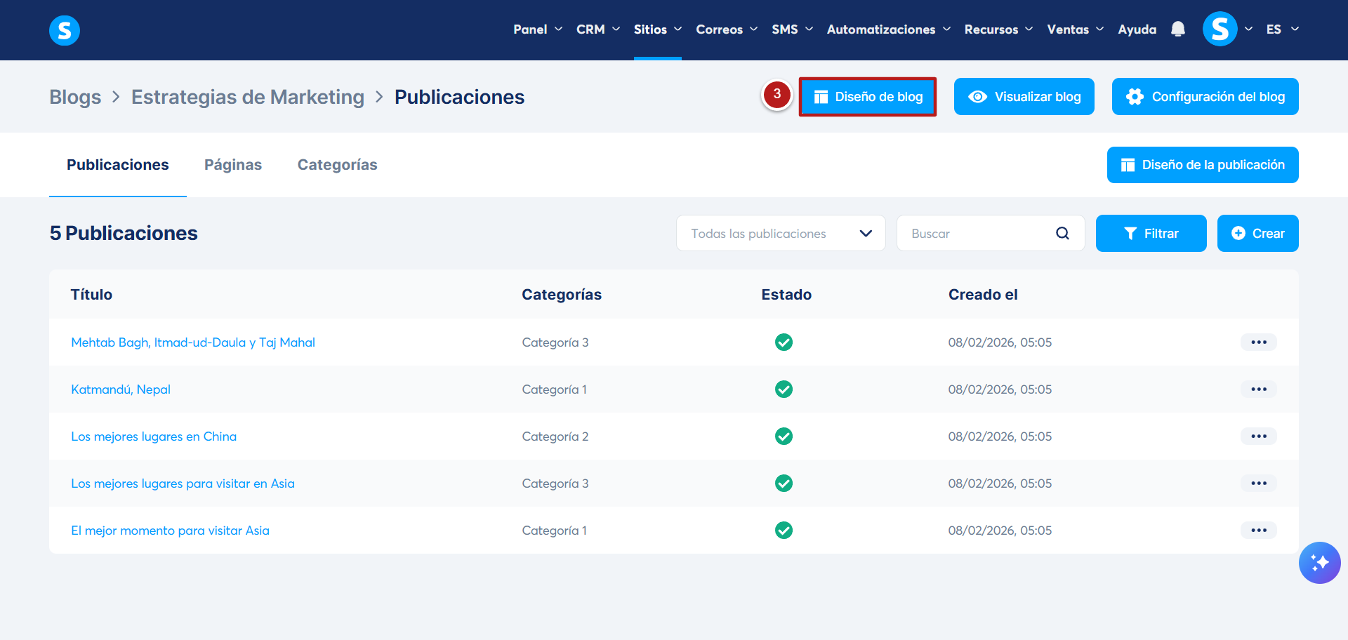 Una vez estés en el menú del blog, haz clic en el botón "Diseño de blog" (número 3).