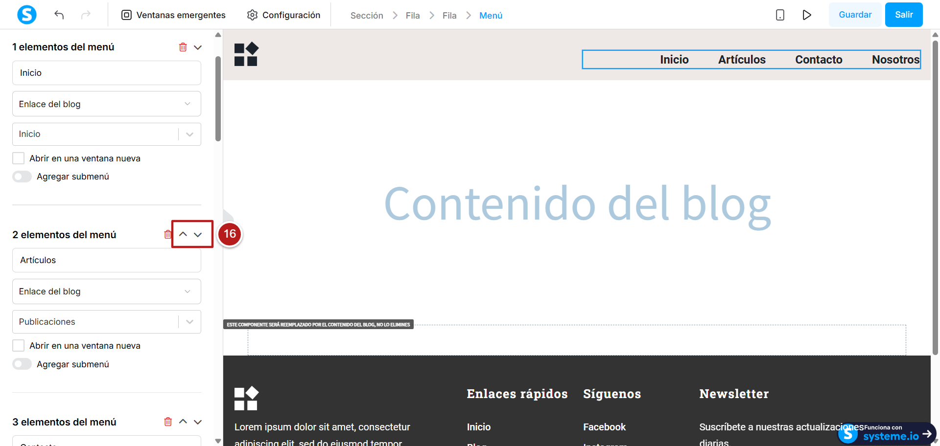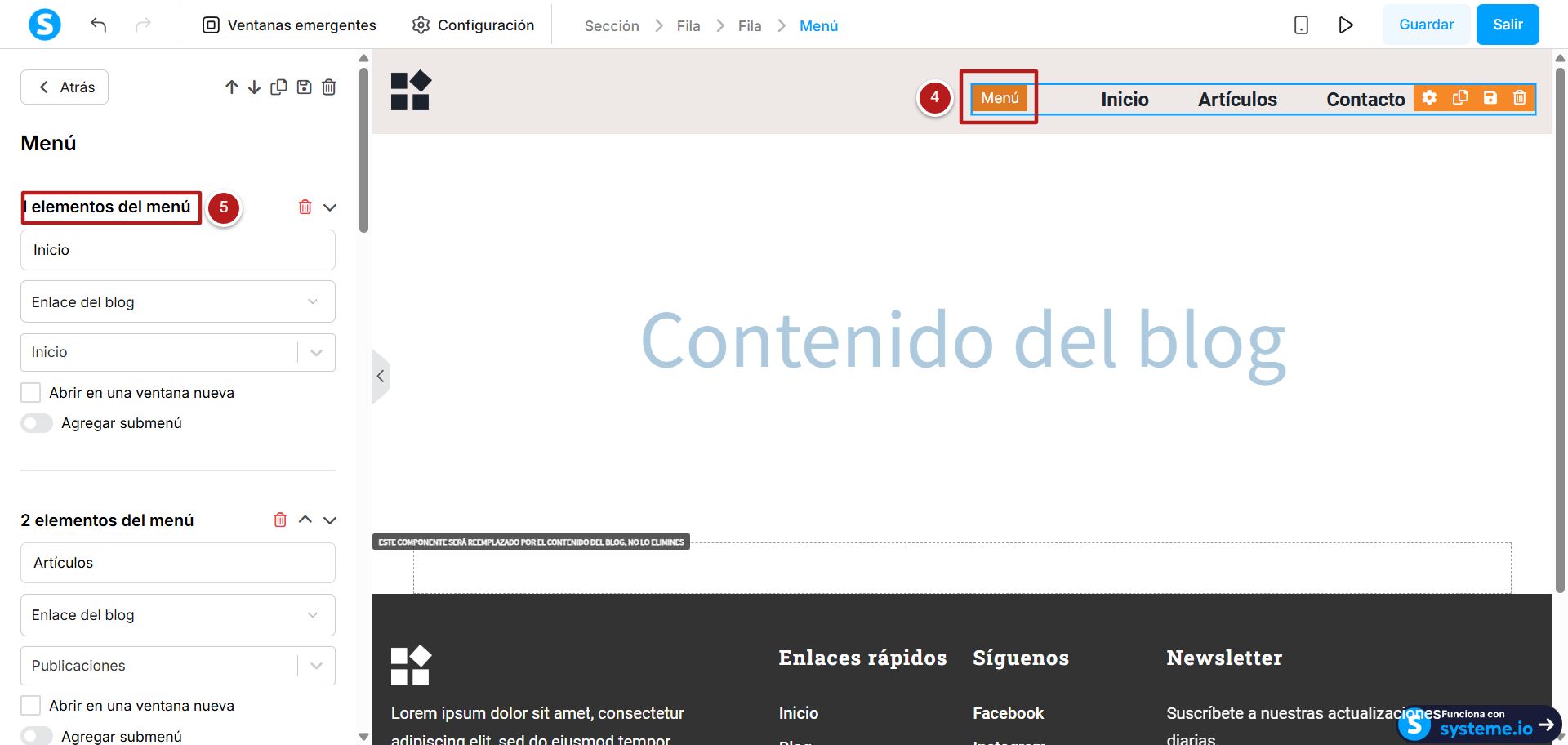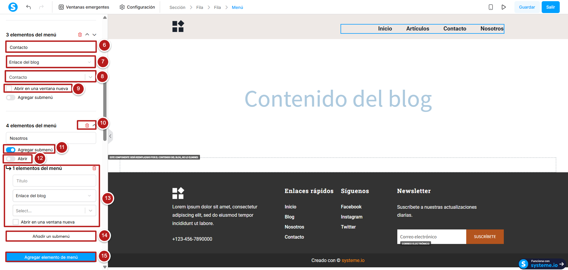 - Eliminar: eliminar elemento desde aquí también lo eliminará desde la configuración y del menú de la página (número 9)