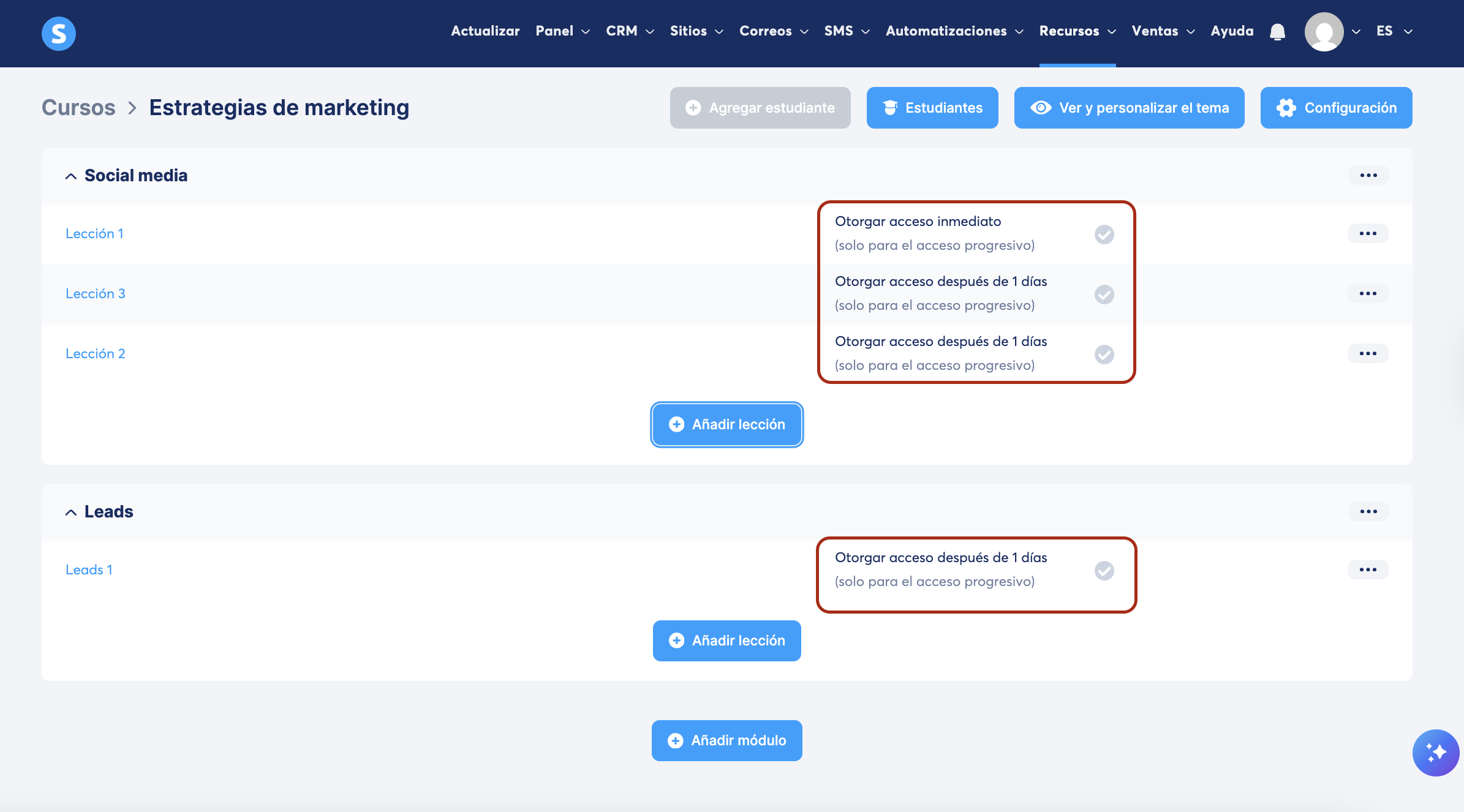 - Acceso total: con esta opción, los estudiantes tendrán acceso inmediato a todos los módulos y lecciones. Cualquier retraso establecido entre las lecciones será ignorado.