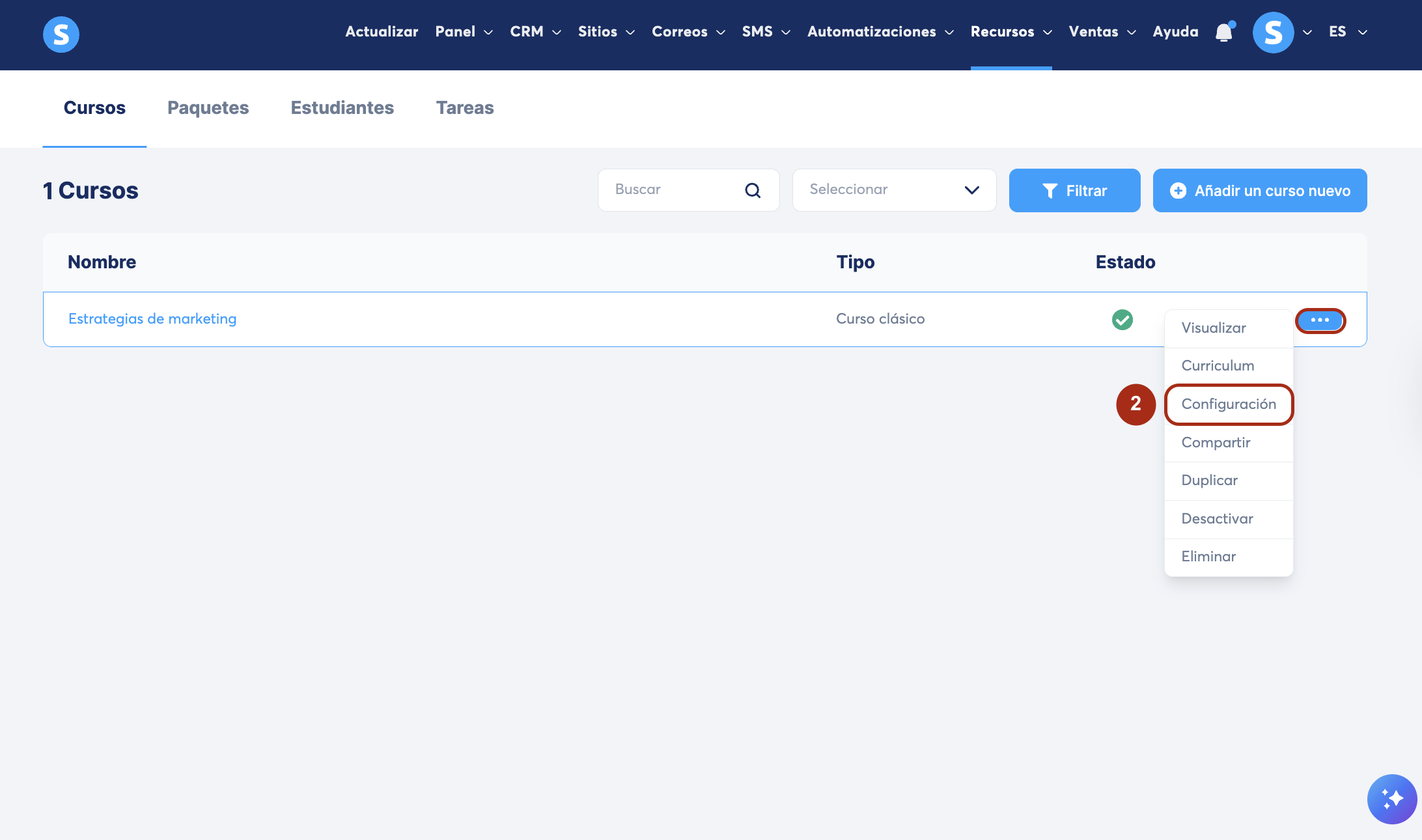 Ubica el curso en la lista de cursos, pasa el cursor sobre los tres puntos y haz clic en Configuración (2) para desplegar la información del curso.