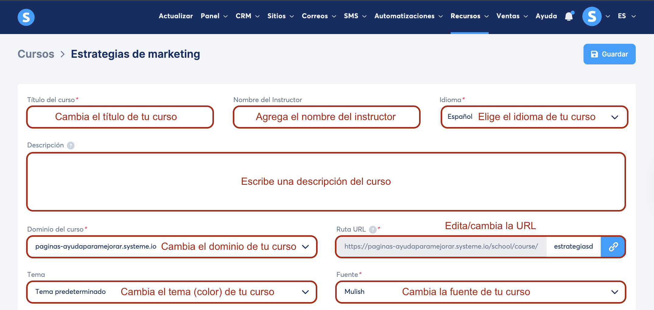 Para guardar tus cambios, haz clic en el botón Guardar en la esquina superior derecha de la página.
