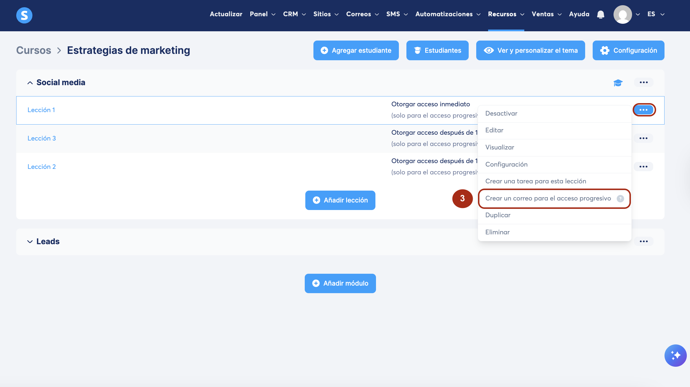 Haz clic en los tres puntos junto a la lección, luego selecciona Crear un correo para el acceso progresivo (3).