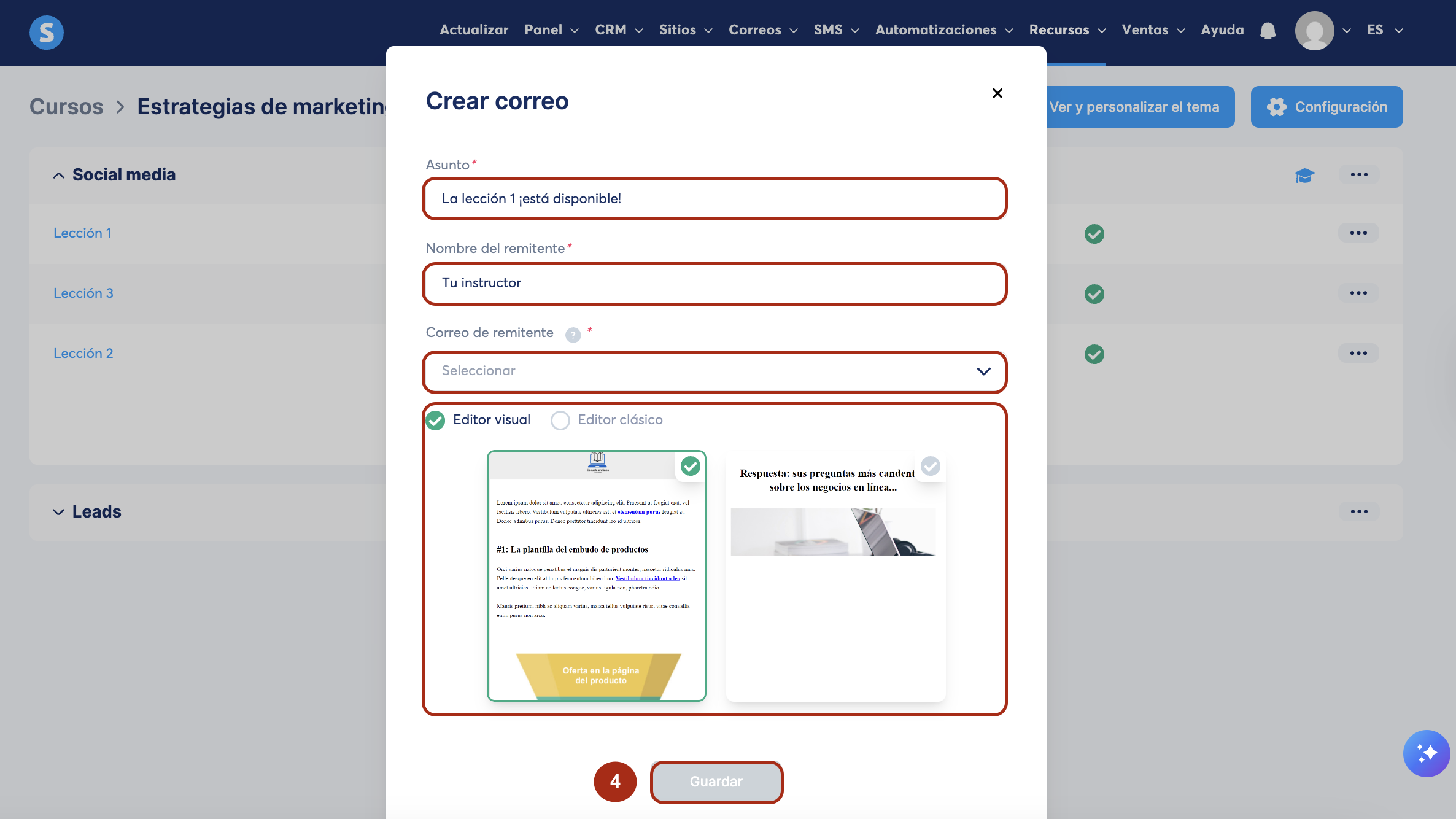 En la ventana emergente, ingresa el asunto, el nombre del remitente y el correo del remitente. Selecciona el editor de correo de tu preferencia (editor visual o editor clásico) y haz clic en Guardar (4)