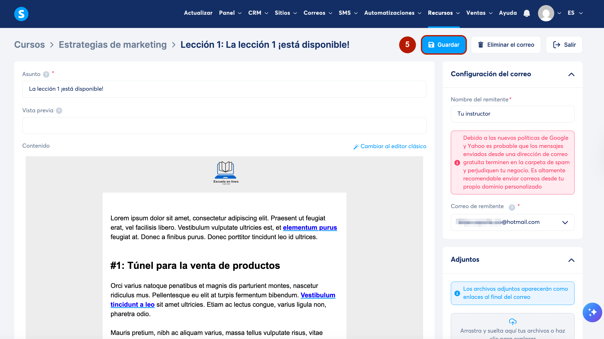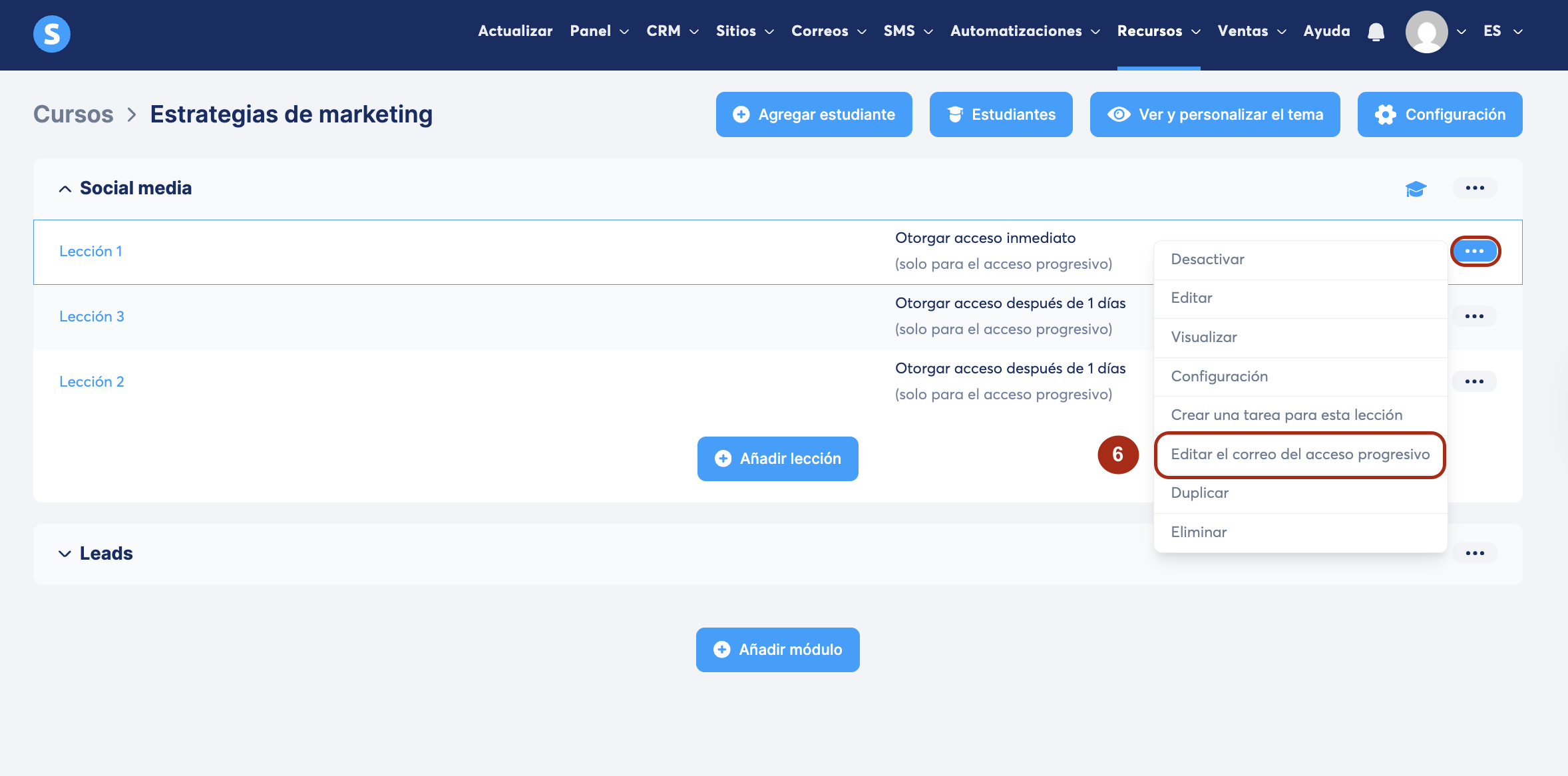 Para después editar el correo, haz clic en los tres puntos junto a la lección y selecciona Editar el correo del acceso progresivo (6).