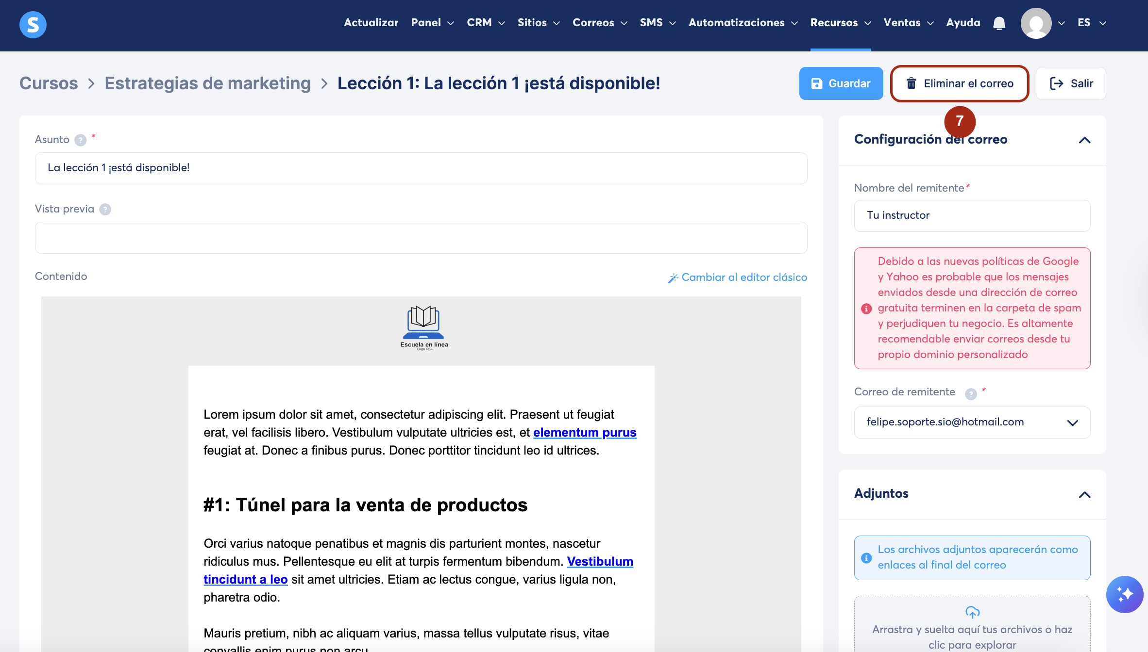 Para eliminar el correo, haz clic en Eliminar el correo (7).