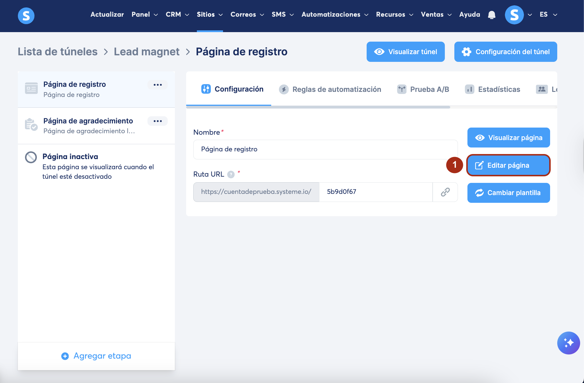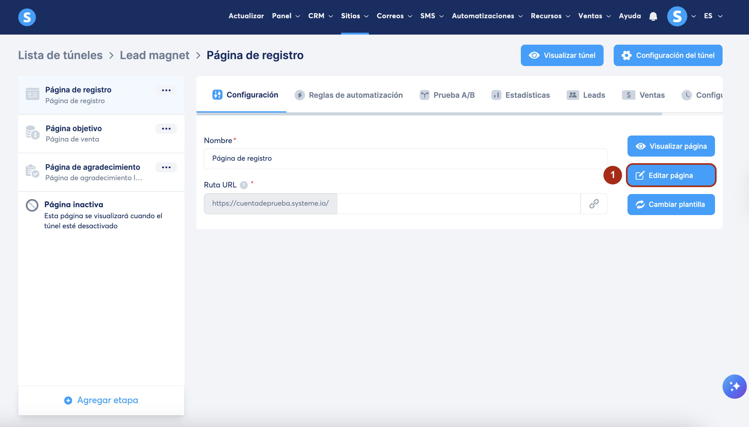 Veamos cómo cargar tus videos a tu cuenta. El siguiente ejemplo usa una página de túnel, pero el proceso es el mismo para cualquier tipo de página en tu cuenta de systeme.io.