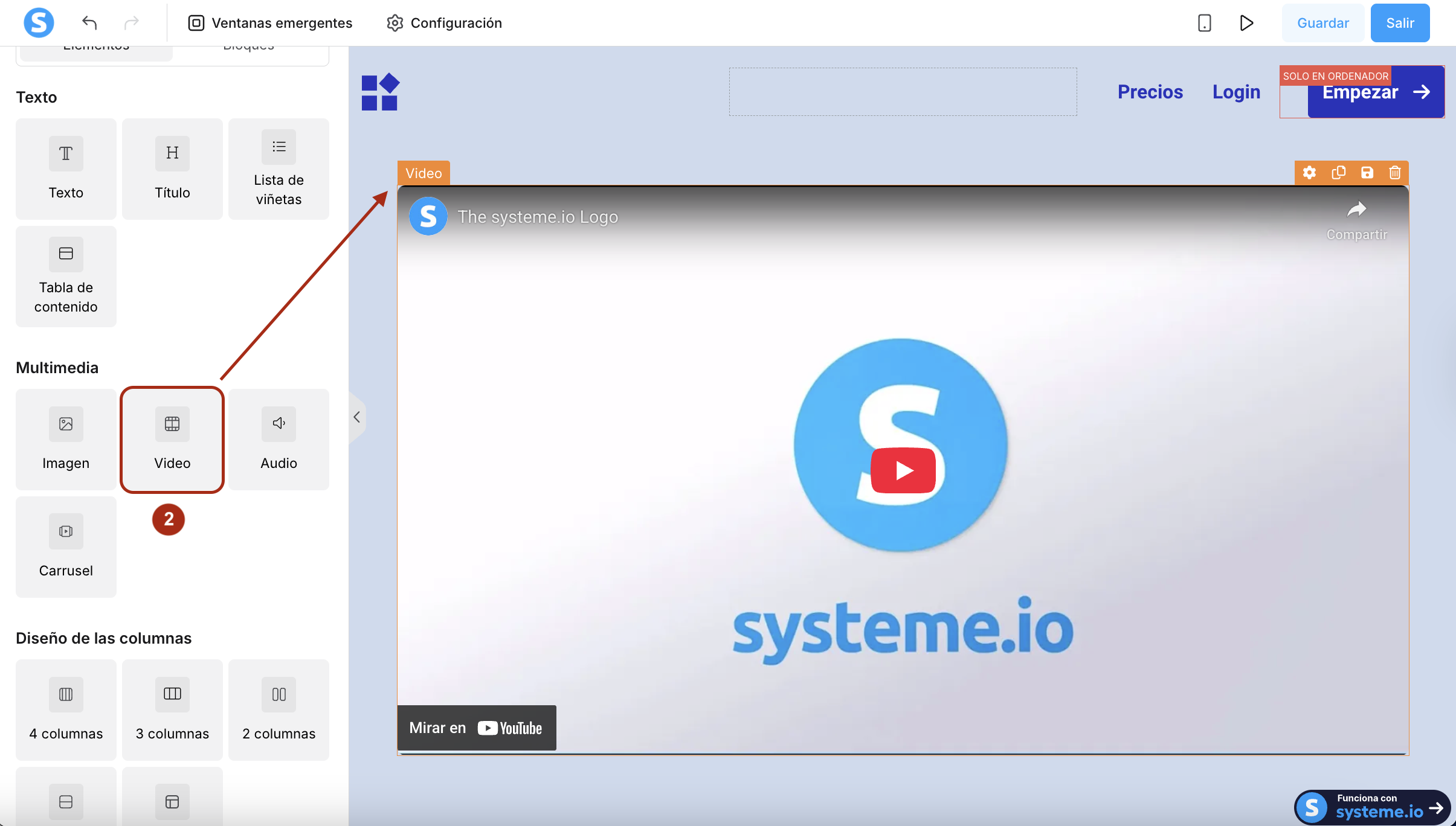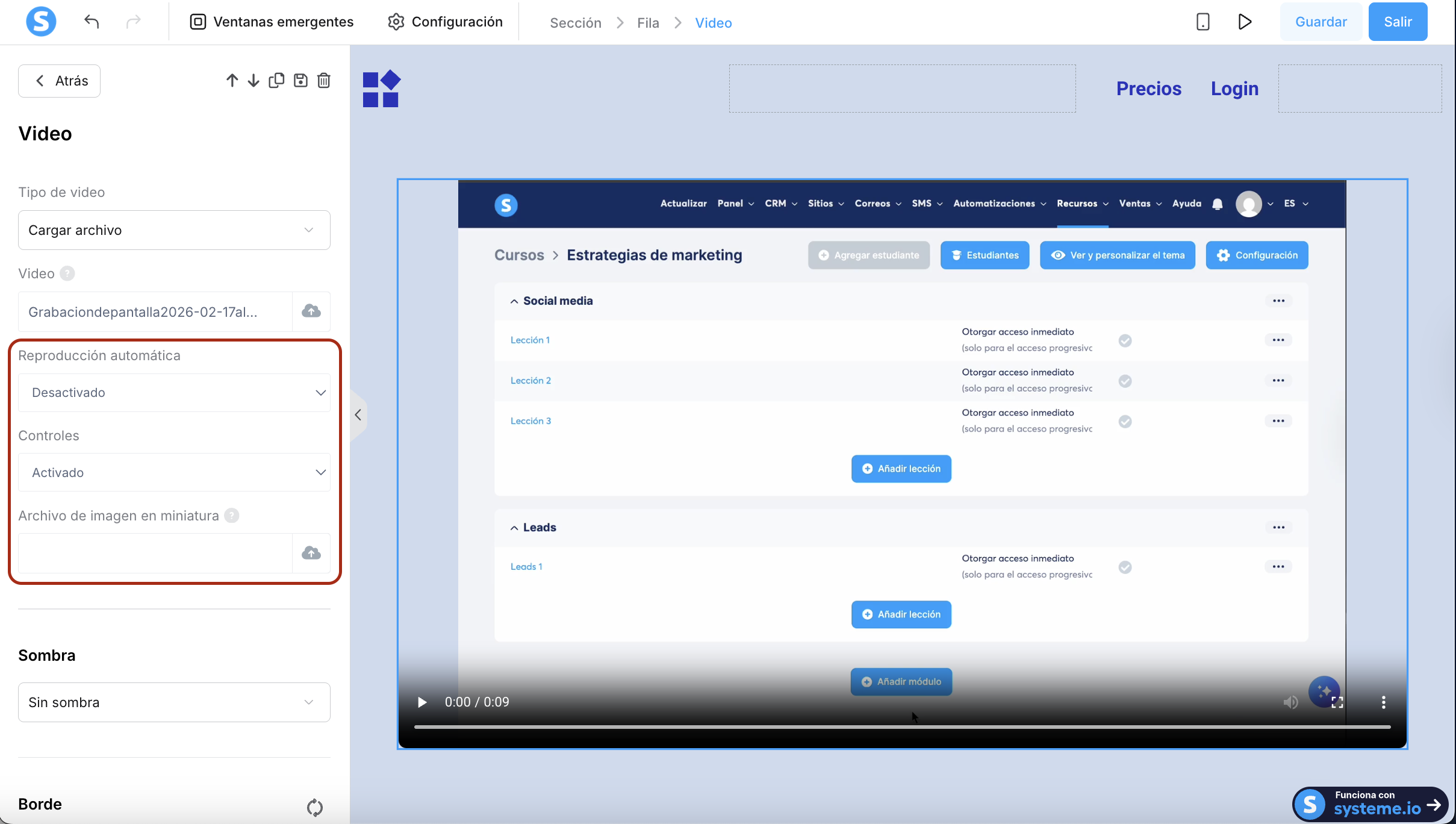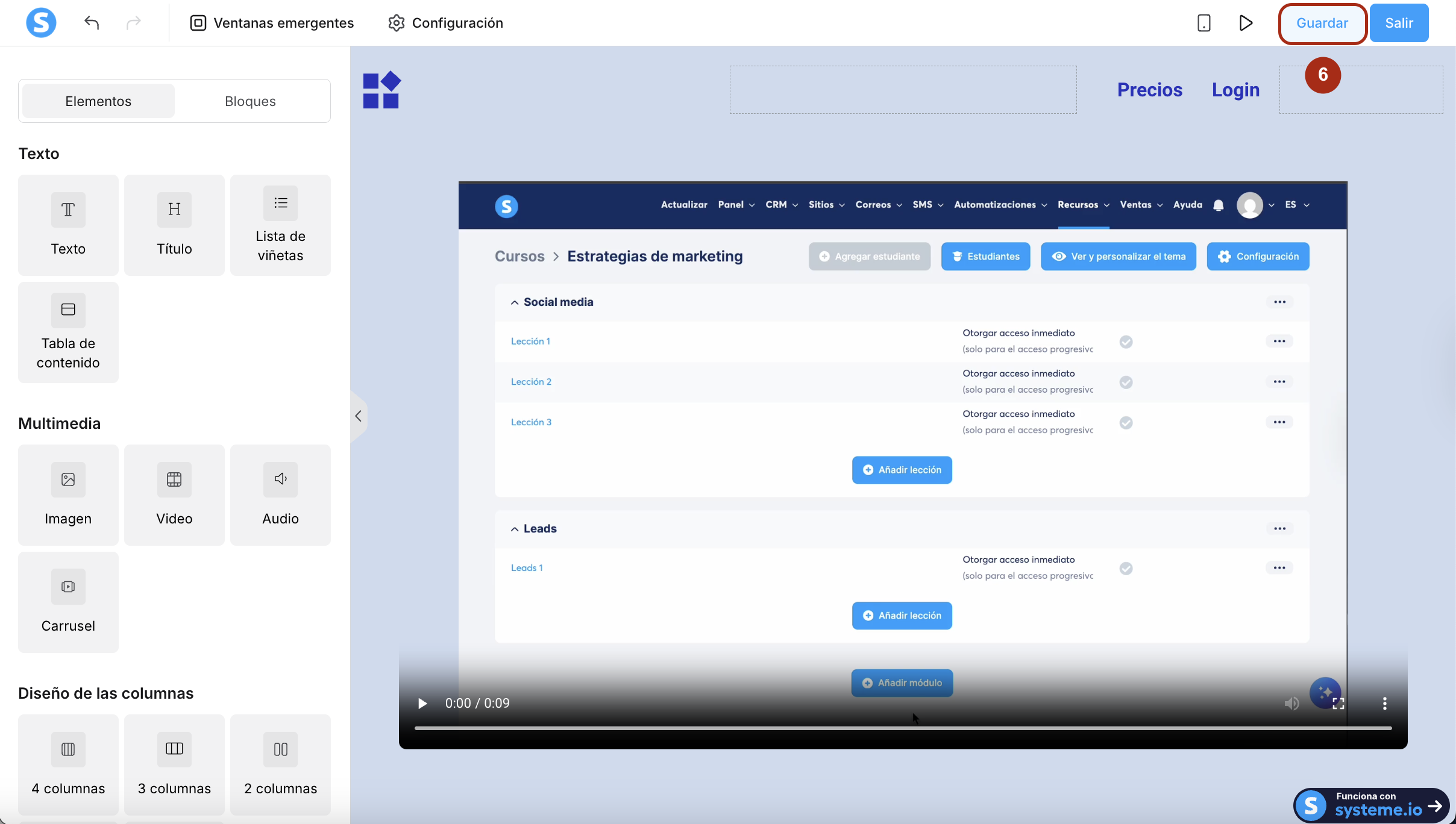 6. ¡Esto es! Ahora tu video está cargado en tu página y alojado en systeme.io. Haz clic en Guardar para aplicar los cambios.