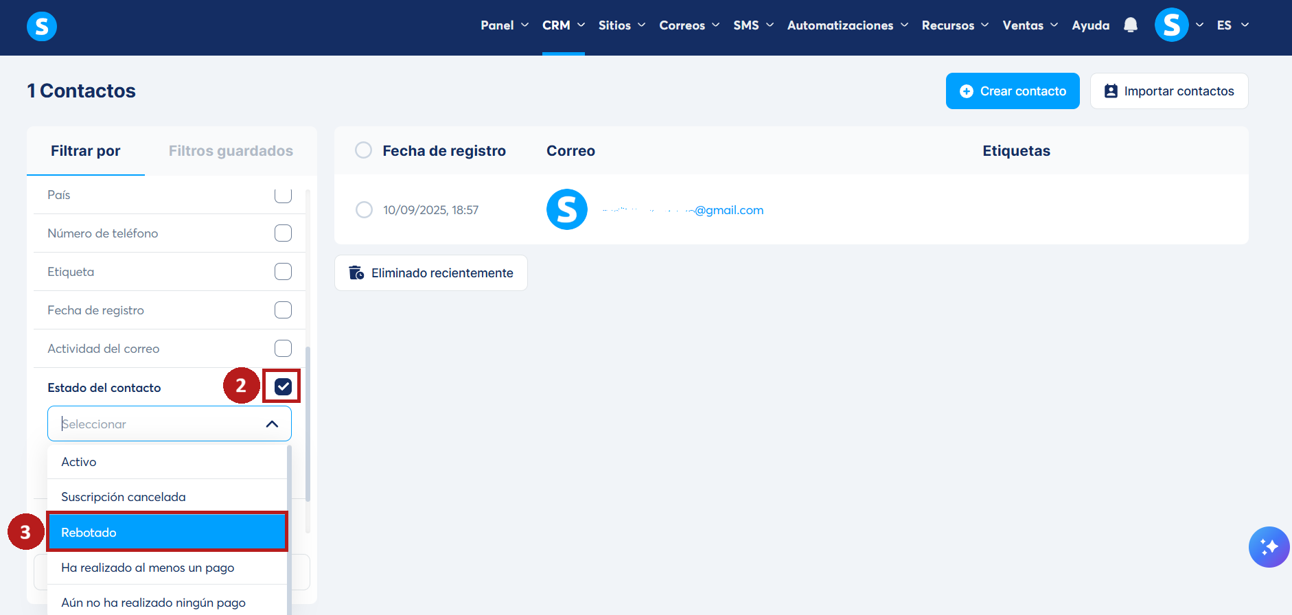 Haz clic en el filtro Estado del contacto (2) y selecciona Rebotado (3). La lista mostrará únicamente los contactos con estado rebotado.