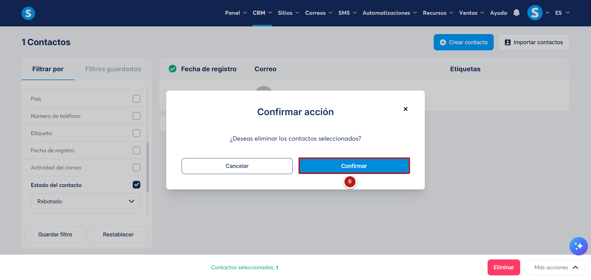 Finalmente, haz clic en Confirmar (6) para eliminar el contacto o los contactos de tu lista.