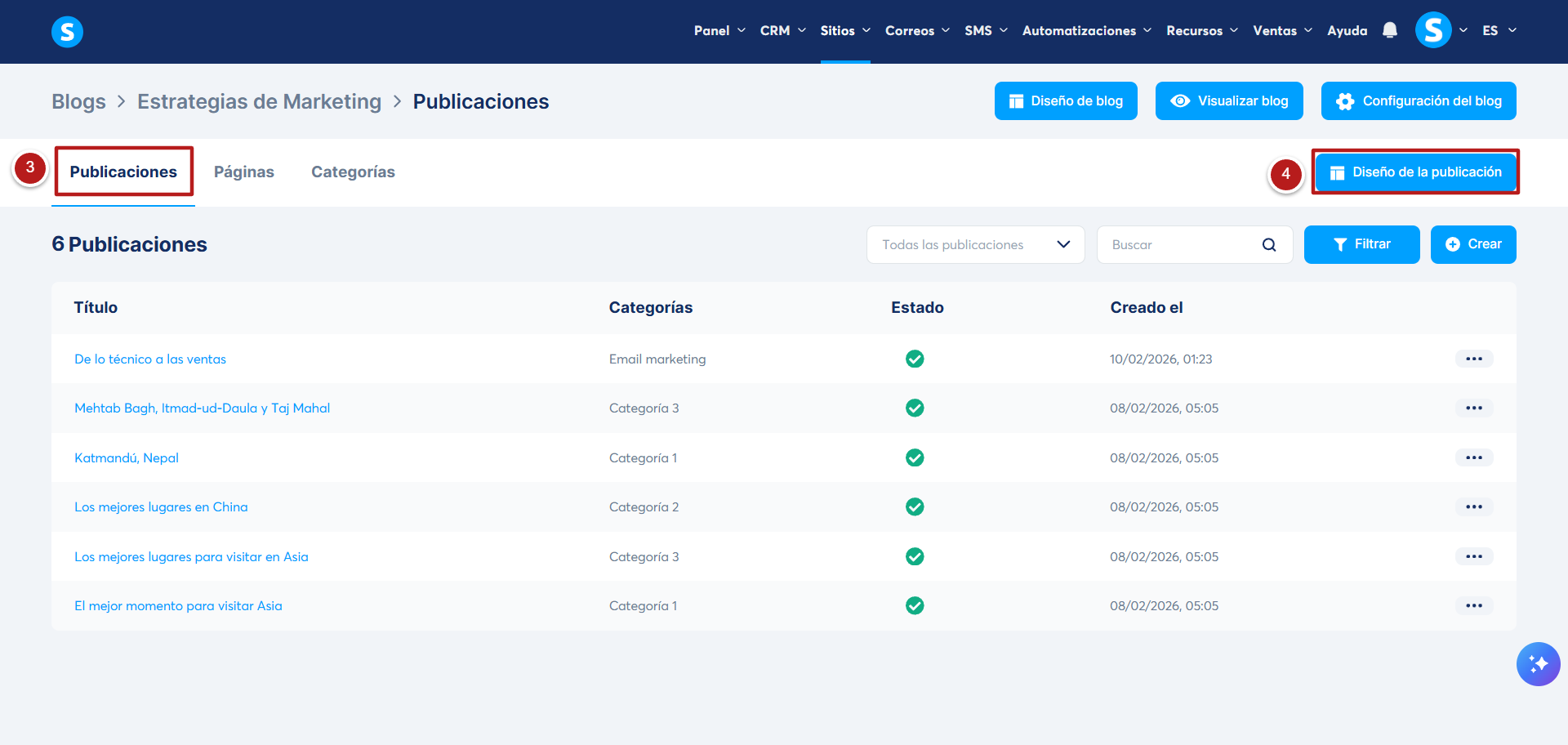 Desde el menú del blog, ve a la sección Publicaciones (3), luego haz clic en Diseño de publicación (4).