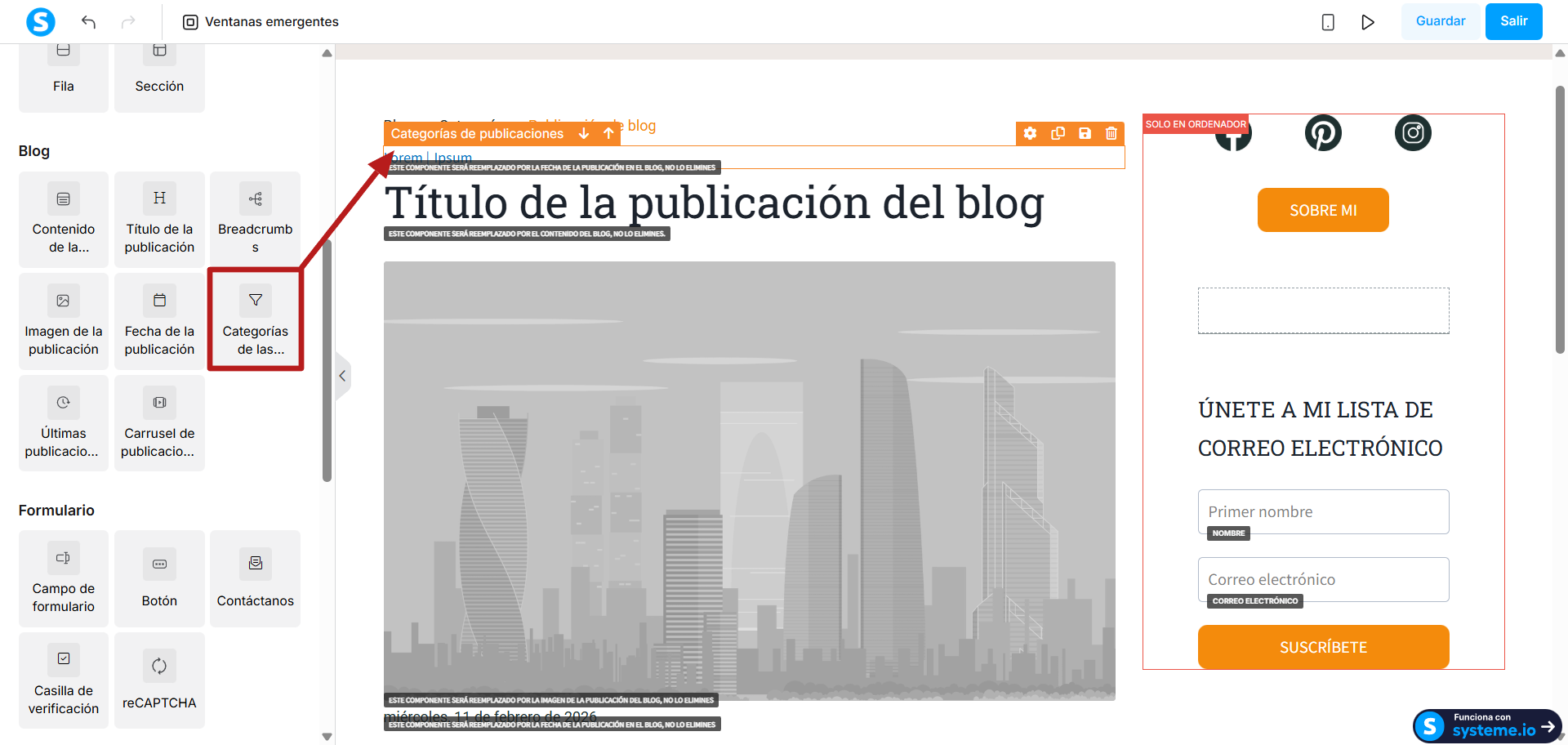 1. Categorías de publicaciones: Este elemento será reemplazado automáticamente por la categoría (o categorías) asignadas a la publicación específica.