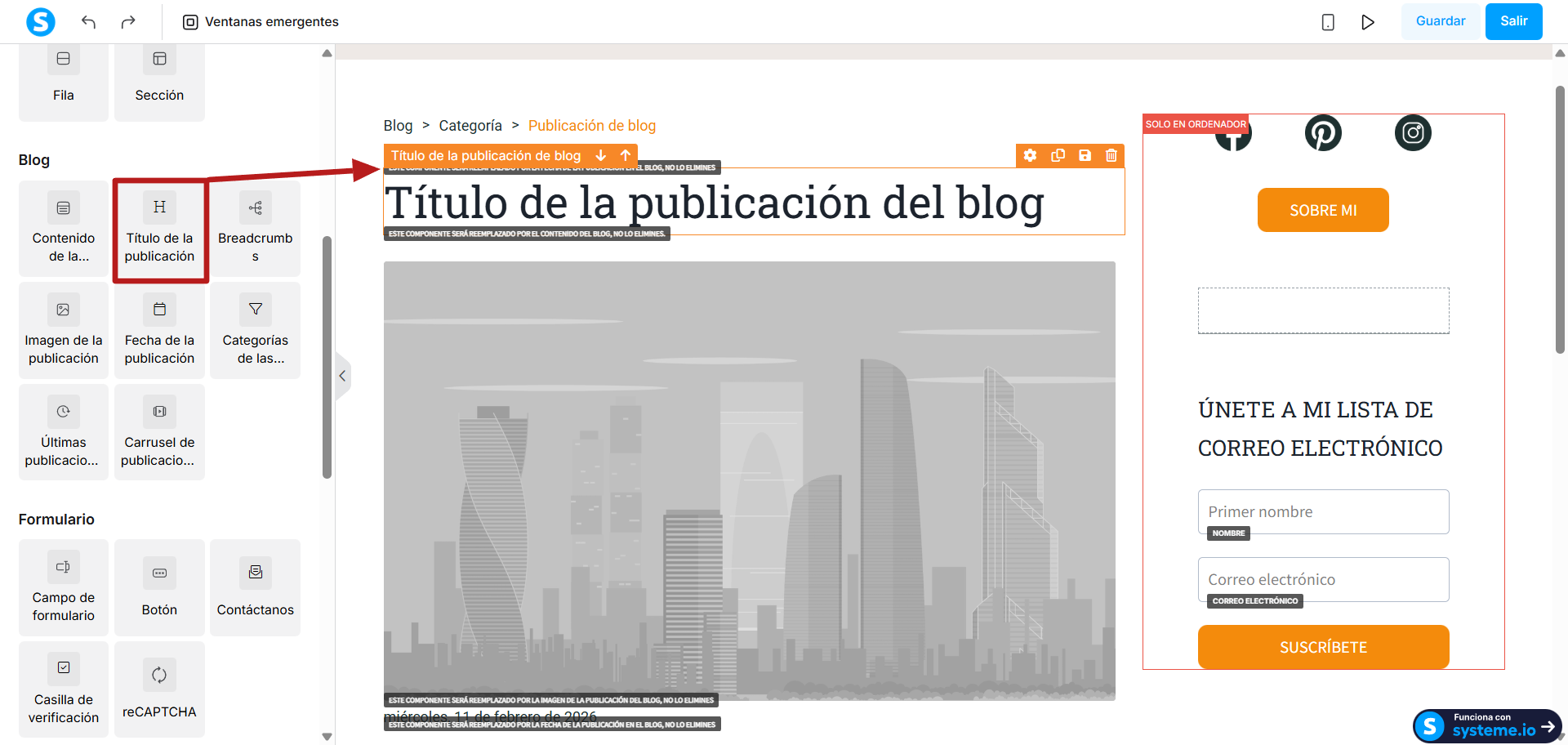 2. Título de la publicación de blog: Este elemento será reemplazado automáticamente por el título de la publicación.