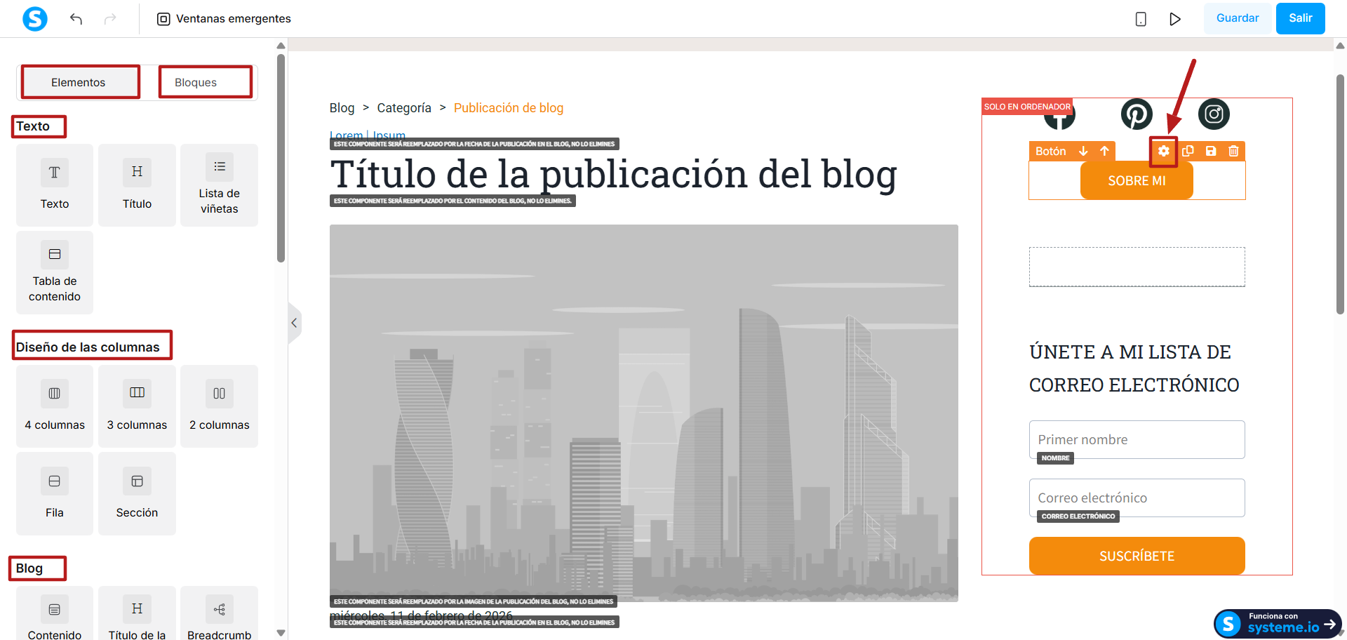 Cualquier elemento o bloque puede añadirse al diseño de la publicación. Simplemente arrástralos desde el panel izquierdo y suéltalos en tu página. Pueden configurarse según sea necesario haciendo clic en el ícono de Configuración de cada elemento.