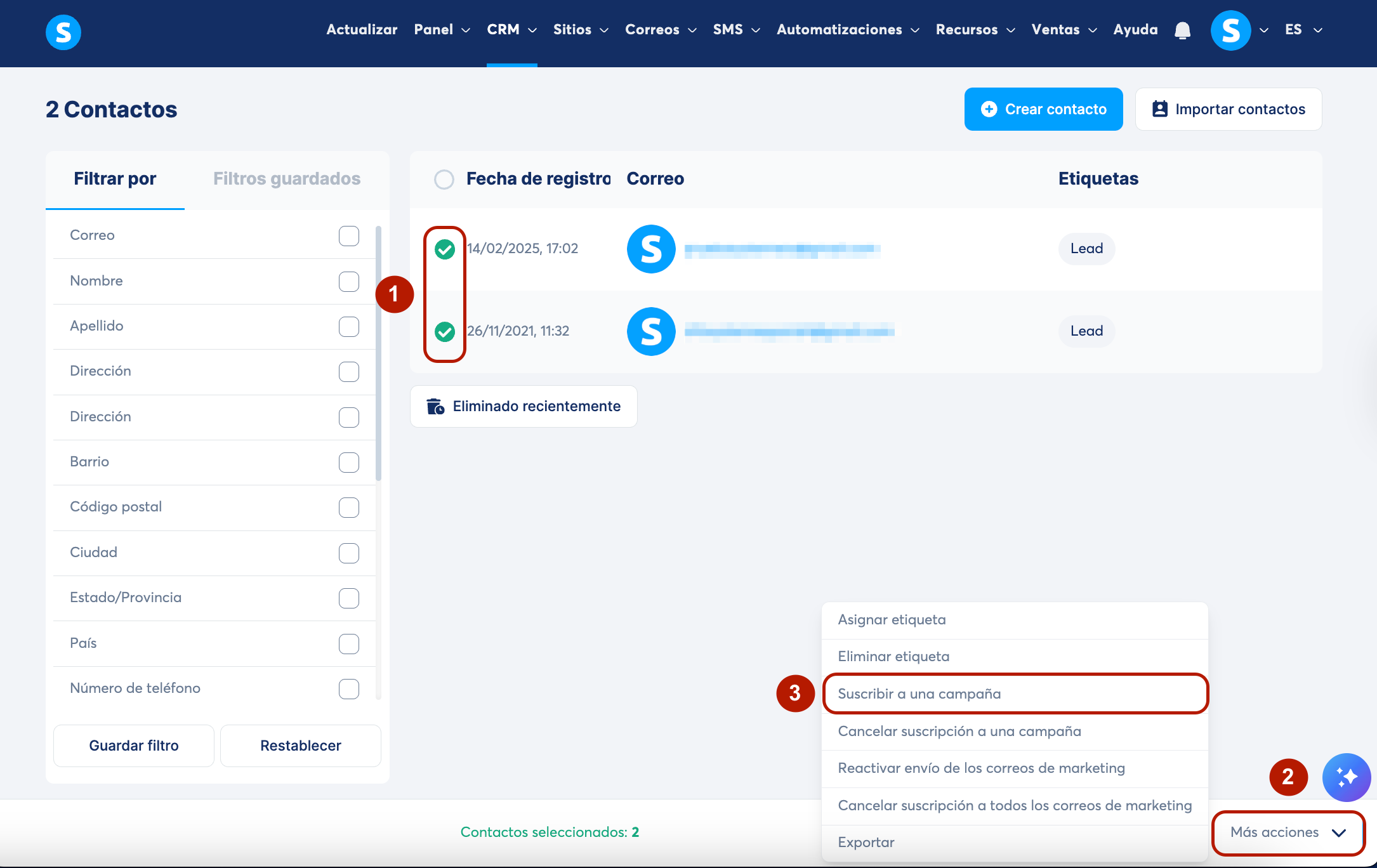 Selecciona los contactos que deseas suscribir marcando las casillas junto a sus correos electrónicos (2).