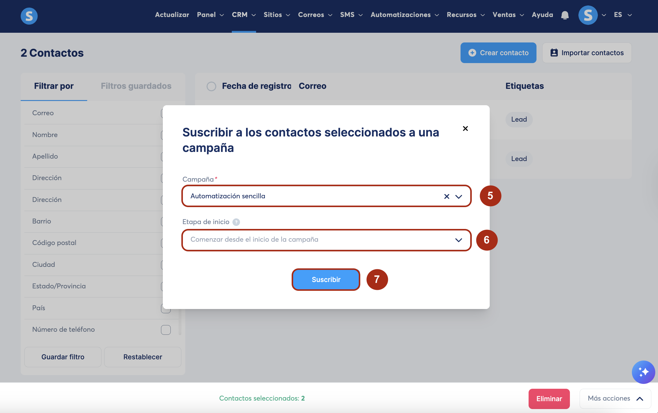 Selecciona la campaña (5) y establece la etapa en donde deseas que los contactos empiecen (6).