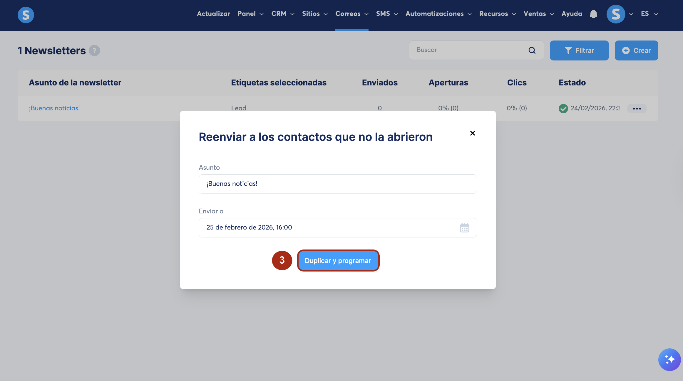 Selecciona la fecha y hora en la que deseas reenviar la newsletter, luego haz clic en Duplicar y programar (3).