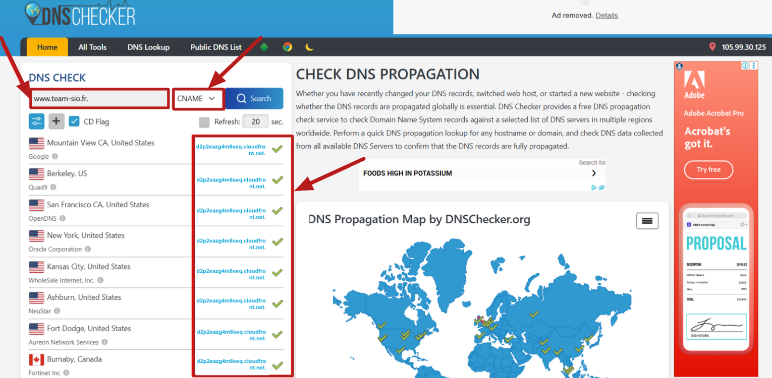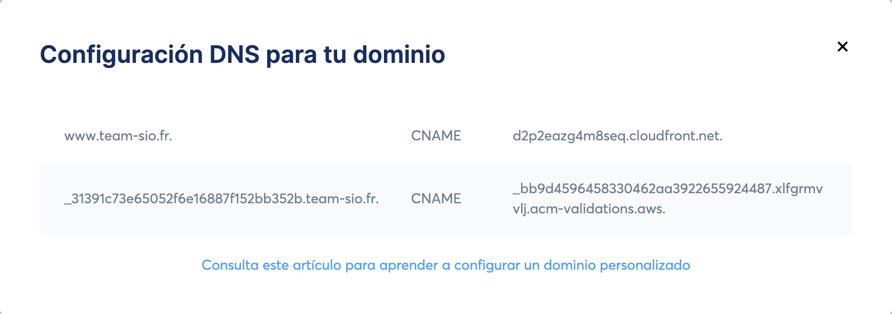 Una vez que los dos registros CNAME se hayan agregado correctamente a tu proveedor de hosting, puedes verificar su estado usando la siguiente herramienta: https://dnschecker.org